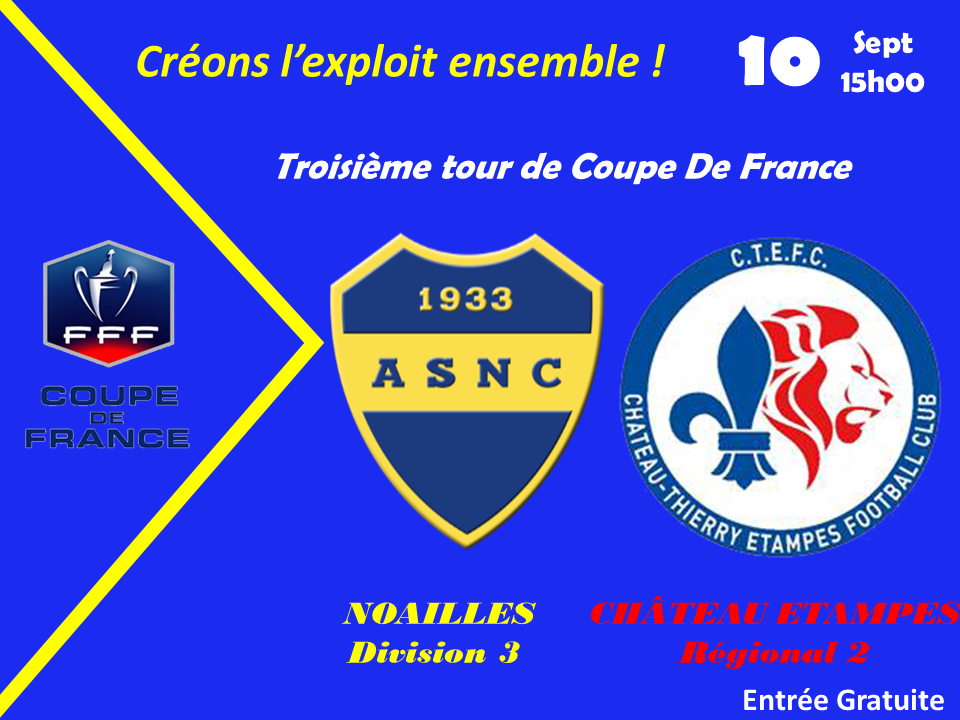 Après leur belle victoire 2 à 1 contre Laboissière dans le Derby au second tour, les Noaillais accueilleront Chateau Etampes club de R2 anciennement PH de l' Aisne ce dimanche 10 Septembre à 15h00.