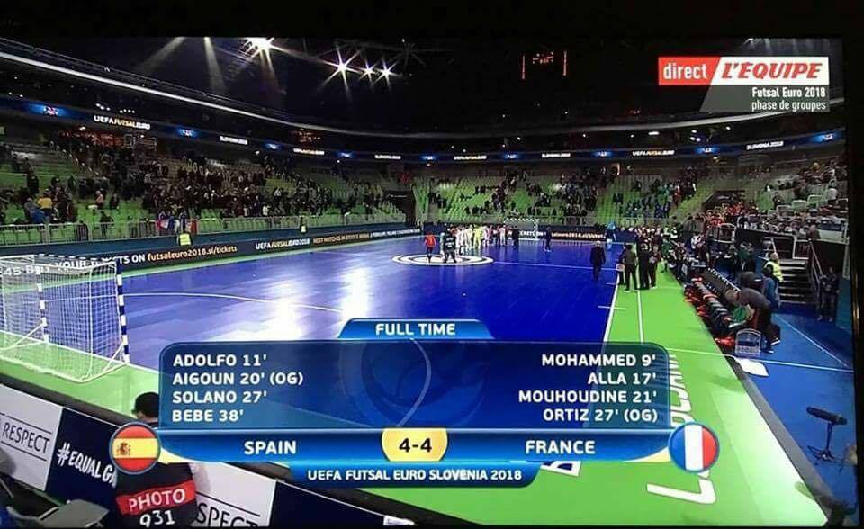 Quelle première pour l'équipe de France de futsal ! Les Français, qualifiés pour leur premier Euro, ont débuté jeudi soir par un superbe et inattendu match nul contre l'Espagne (4-4), tenante du titre et l'une des meilleures équipes au monde. Les Bleus ont même failli créer un exploit encore plus colossal, puisqu'ils menaient 4-3 jusqu'à l'égalisation espagnole, à deux minutes de la fin.