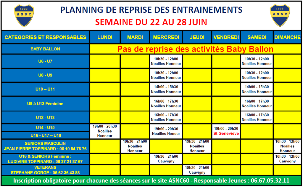 Hier nous vous avons annoncé une reprise des entrainements à partir du lundi 22 juin, voici le planning ci-dessous pour la semaine du 22 au 28 Juin.
