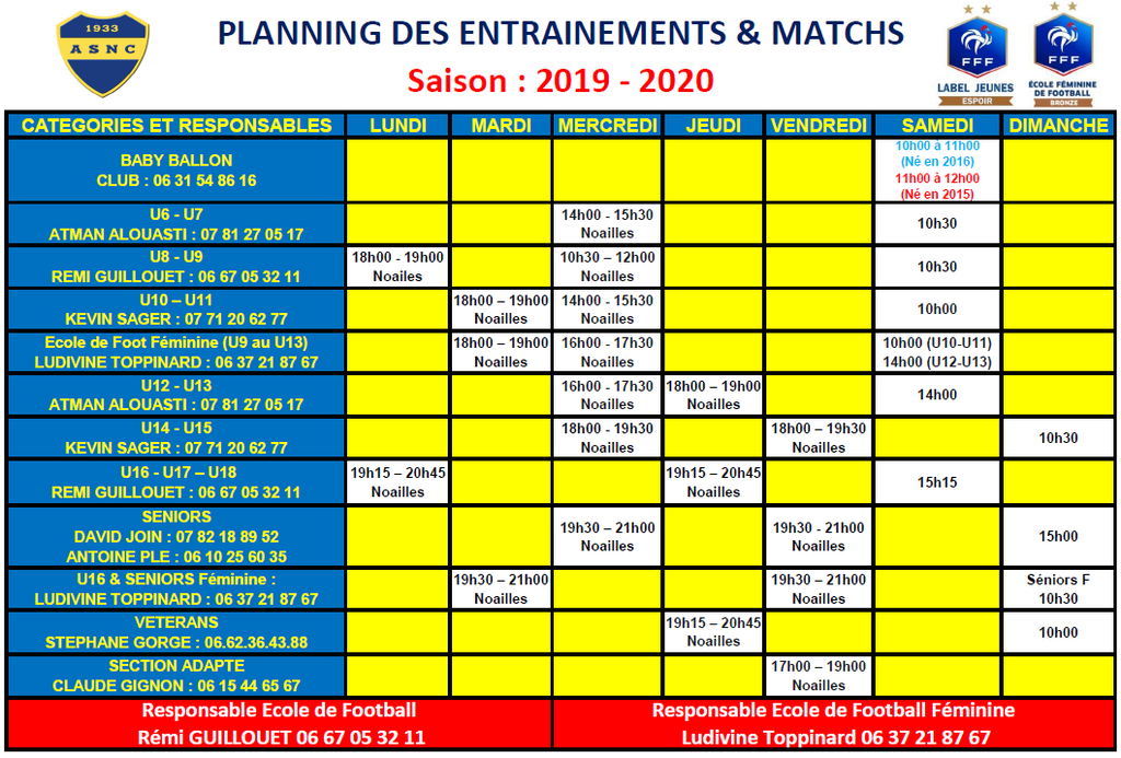 Nous venons de finaliser l'organigramme sportif ainsi que les horaires des entrainements.