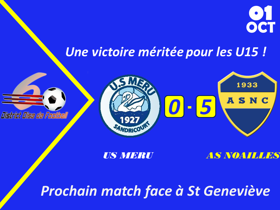 Ce dimanche 1 er octobre les U15 se déplaçaient à Méru et nous voulions confirmer notre bon début de saison (malgré la défaite en coupe de l’Oise face à Gouvieux D1) et c’est chose faite ! Les Noaillais ont respecté le plan de jeu défini et ont su se rendre le match facile en remportant la quasi-totalité des duels.
